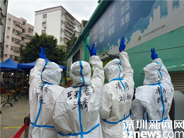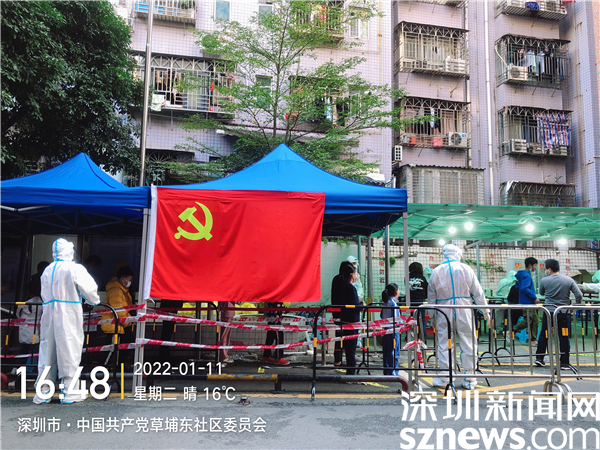 黨旗在羅湖區(qū)東曉街道草埔東社區(qū)嚇圍核酸檢測(cè)點(diǎn)高高飄揚(yáng)。