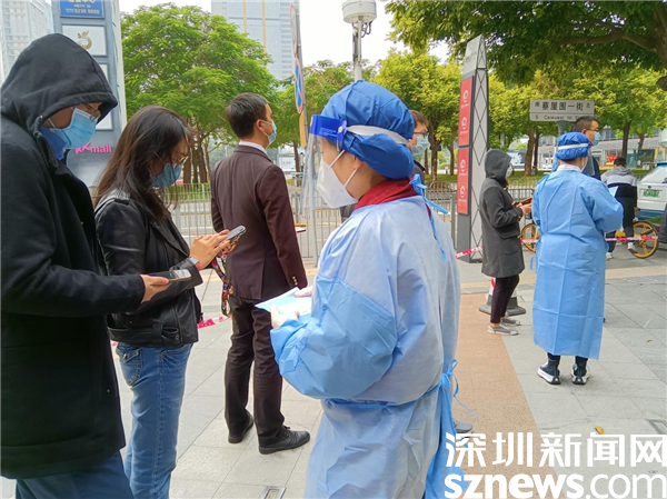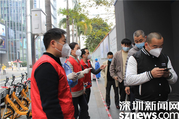 1月14日,深圳市京基智農(nóng)時代股份有限公司總部黨支部黨委副書記張玲帶領5位黨員,火速來到禧程酒店臨時檢測點,經(jīng)過簡短的培訓,他們集體上崗,各就其位。有的維持秩序,有的在外圍協(xié)助查驗綠碼,有的協(xié)助出示粵酸碼。黃子亮和彭乾偉穿上防護服,現(xiàn)學現(xiàn)做,使用自己的手機為前來采用的市民掃描粵酸碼。他們都是青壯年,雖然這是關鍵崗位,但他們一學就會,很快上手。十人一管,掃碼上傳,有條不紊,忙而不亂。