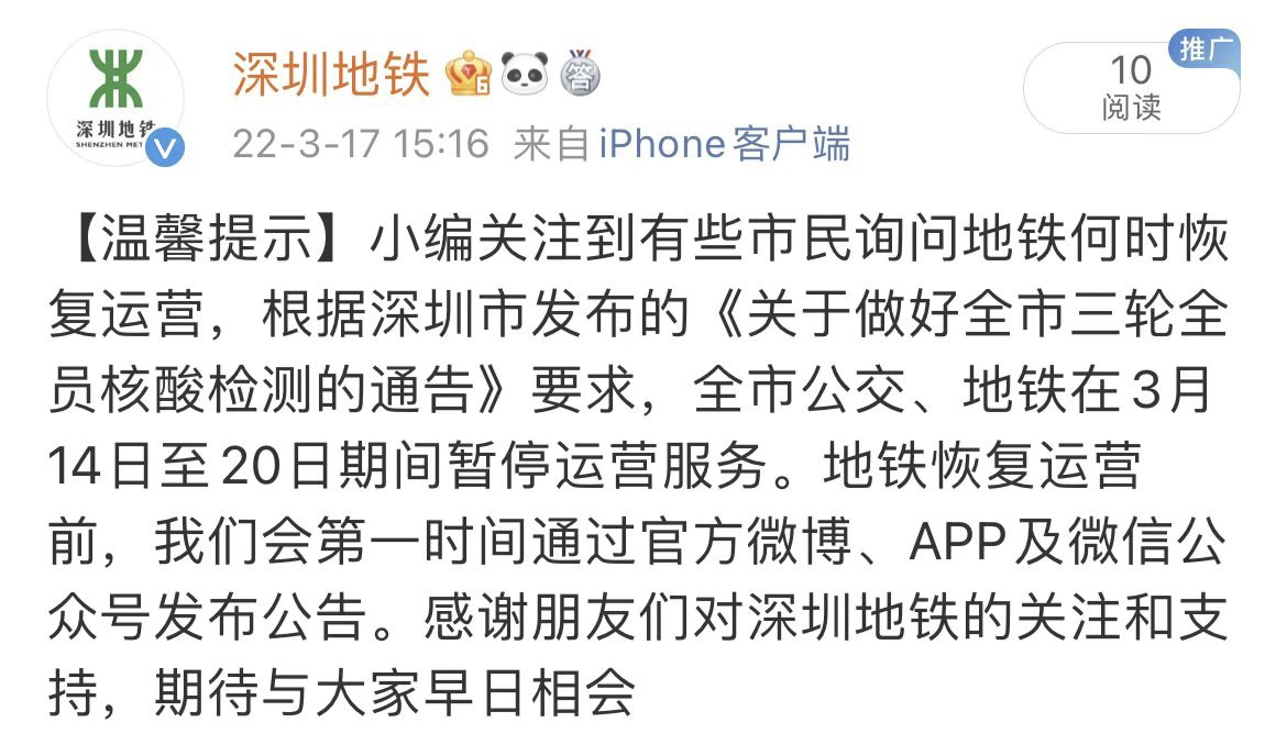 對此,記者向深圳地鐵求證,深圳地鐵表示,根據(jù)深圳市發(fā)布的《關(guān)于做好全市三輪全員核酸檢測的通告》要求,全市公交、地鐵在3月14日至20日期間暫停運(yùn)營服務(wù)。地鐵恢復(fù)運(yùn)營前,深圳地鐵會(huì)第一時(shí)間通過官方微博、APP及微信公眾號發(fā)布公告。