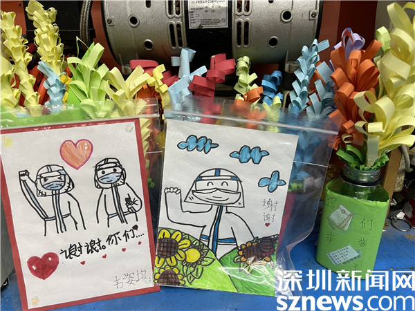 羅湖區(qū)蓮塘小學(xué)某班班長見醫(yī)護(hù)人員和義工志愿者日夜操勞,不辭辛苦,號召全班同學(xué)為防疫人員“送溫暖”。有的同學(xué)親手制作五顏六色的精美手折紙花,還有些同學(xué)別出心裁的繪制了“感謝大白”賀卡,禮物制作完成后,全班同學(xué)分頭行動,將手折紙花送到各核酸采樣點(diǎn)醫(yī)護(hù)人員和志愿者手中?!拔覀儙筒簧鲜裁?,做些力所能及的事情,為大哥哥大姐姐送去感動和力量,也是為抗疫做貢獻(xiàn)?!眮碜粤_湖中醫(yī)院,在蓮塘村七巷小廣場支援的醫(yī)護(hù)人員們收到同學(xué)們送來的“禮物”非常開心,紛紛表示,雖然每天工作很辛苦,但能得到群眾尤其是孩子們的肯定十分幸福,禮物雖小,卻無比溫暖和感動。