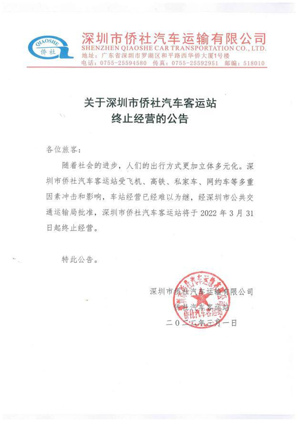 近日,記者從深圳市交通運(yùn)輸局羅湖管理局獲悉,自2022年3月31日起,深圳市僑社汽車客運(yùn)站終止經(jīng)營,這個(gè)營業(yè)了31年的“老牌”汽車客運(yùn)站,正式宣布退休。