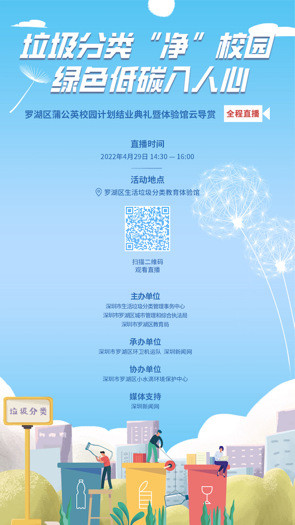 4月29日下午2:30—4:00,羅湖區(qū)首期蒲公英教師培訓迎來結業(yè),羅湖區(qū)垃圾分類體驗館館經歷多月重整布展后煥新重開,屆時,深圳市生活垃圾分類管理事務中心、羅湖區(qū)城市管理和綜合執(zhí)法局和羅湖區(qū)教育局共同舉辦垃圾分類“凈”校園綠色低碳入人心——羅湖區(qū)蒲公英校園計劃結業(yè)典禮暨科普館云導賞活動,深圳新聞網將進行全程直播,歡迎各位網友觀看。