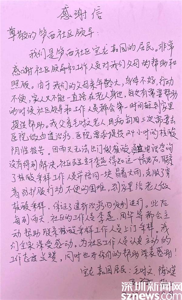 讀特客戶端·深圳新聞網(wǎng)2022年6月13日訊(記者 劉嘉敏 通訊員 李秀甜)近日,羅湖區(qū)筍崗街道筍西社區(qū)寶龍嘉園住戶毛時(shí)文的老伴陳漢英阿姨來(lái)到筍西社區(qū)工作站,送上了一封手寫的感謝信,感謝社區(qū)提供貼心的上門核酸采樣服務(wù)。