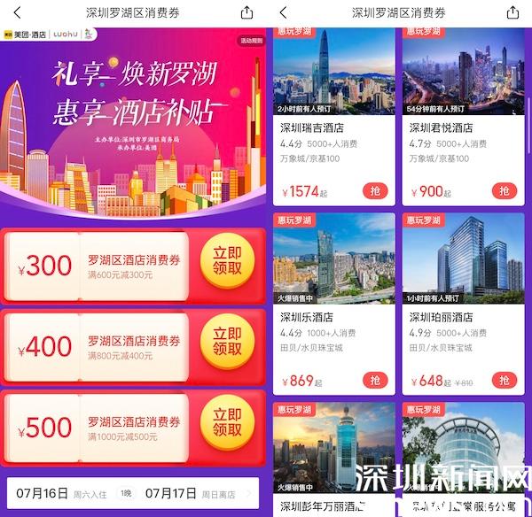 讀特客戶端·深圳新聞網(wǎng)2022年7月16日訊(記者 覃鈺清)7月16日,羅湖區(qū)會(huì)同羅湖區(qū)酒店行業(yè)協(xié)會(huì)、美團(tuán)推出“禮享煥新羅湖,惠享酒店補(bǔ)貼”活動(dòng),投入33萬扶持資金,用于支持酒店、住宿消費(fèi)。消費(fèi)者可在美團(tuán)APP搜索“羅湖消費(fèi)券”、“羅湖酒店消費(fèi)券”等關(guān)鍵詞進(jìn)入活動(dòng)頁面,點(diǎn)擊“領(lǐng)取”按鈕即可獲得。本次優(yōu)惠額度包括:滿1000元減500元、滿800元減400元、滿600元減300元,最高五折優(yōu)惠,可在羅湖轄區(qū)內(nèi)40余家酒店使用。