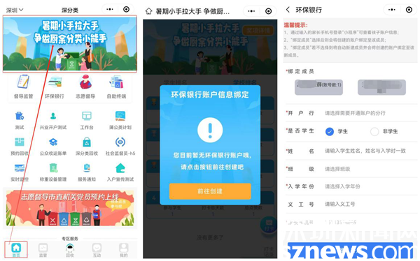 學(xué)生及家長(zhǎng)可通過“深分類”小程序首頁(yè)主題活動(dòng)入口進(jìn)入活動(dòng)。在參與活動(dòng)之前,學(xué)生所在學(xué)校需開通環(huán)保銀行支行,學(xué)生需注冊(cè)所在學(xué)校支行的環(huán)保銀行賬戶,并在活動(dòng)中進(jìn)行賬戶信息綁定、上傳參與學(xué)生照片才可參與后續(xù)打卡集贊活動(dòng)。