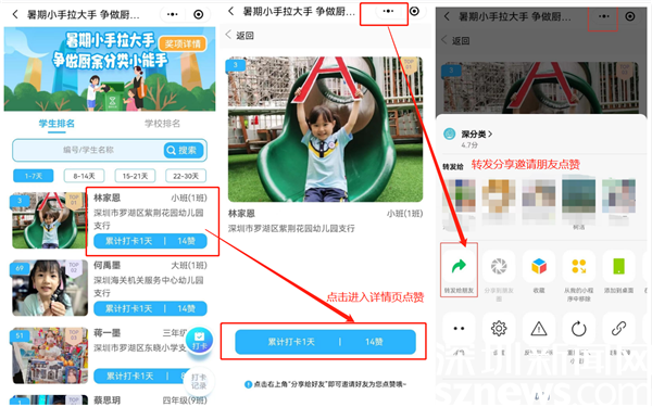 活動(dòng)期間,學(xué)生需在活動(dòng)頁(yè)上傳廚余垃圾分出和個(gè)人廚余垃圾投放共2張照片完成當(dāng)日打卡;同時(shí),在排行頁(yè)面可搜索進(jìn)入本人頁(yè)面進(jìn)行點(diǎn)贊,分享個(gè)人頁(yè)面至微信群和好友進(jìn)行集贊等;每個(gè)用戶每天擁有5次點(diǎn)贊?rùn)C(jī)會(huì),每天僅可為一位用戶點(diǎn)贊一次。