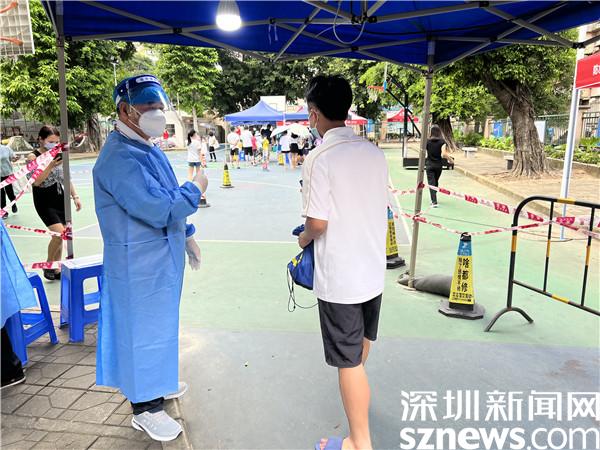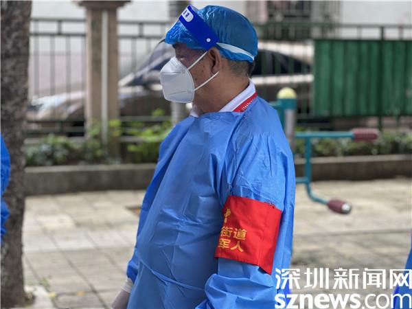 每到下午4點(diǎn),羅湖區(qū)翠竹街道龍屋小區(qū)的籃球場(chǎng)上,都有陸陸續(xù)續(xù)迎來(lái)做核酸的居民,而李任平,則會(huì)提前半個(gè)小時(shí)到達(dá)現(xiàn)場(chǎng)準(zhǔn)備,每日如此,風(fēng)雨無(wú)阻。穿上防護(hù)服,戴上防護(hù)面罩,將“翠竹街道退役軍人”的臂章戴上,鮮紅的黨員徽章別在胸前,李任平就開(kāi)始站在核酸檢測(cè)點(diǎn)卡口前,指引做核酸的居民掃碼、亮碼,維持秩序。