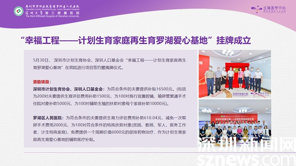 今年初,深圳市計(jì)劃生育協(xié)會(huì)、人口基金會(huì)就創(chuàng)建了一項(xiàng)“幸福工程”,旨在為計(jì)劃生育家庭再生育提供幫助。今年5月30日,第一個(gè)幸福工程基地就選擇坐落于羅湖醫(yī)院,項(xiàng)目為符合條件的夫妻提供總額高達(dá)16500元的醫(yī)療補(bǔ)貼,同時(shí),羅湖醫(yī)院還給予相應(yīng)的醫(yī)療減免,包括手術(shù)及藥品費(fèi)用的配套補(bǔ)貼。為居民再生育提供了很好的幫助,大大降低了經(jīng)濟(jì)壓力,讓更多的家庭愿意再生育。