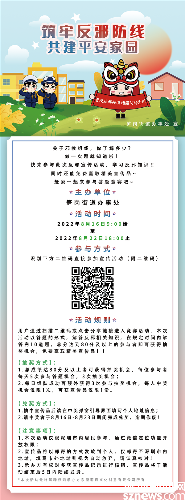 近期,筍崗街道辦攜手“粵小正”在轄區(qū)開展為期一周的線上宣傳活動(dòng),活動(dòng)海報(bào)與鏈接中均以“粵小正”為主體,引導(dǎo)參與者觀看反邪教相關(guān)視頻學(xué)習(xí)正確認(rèn)識(shí)邪教、參加有獎(jiǎng)問答。