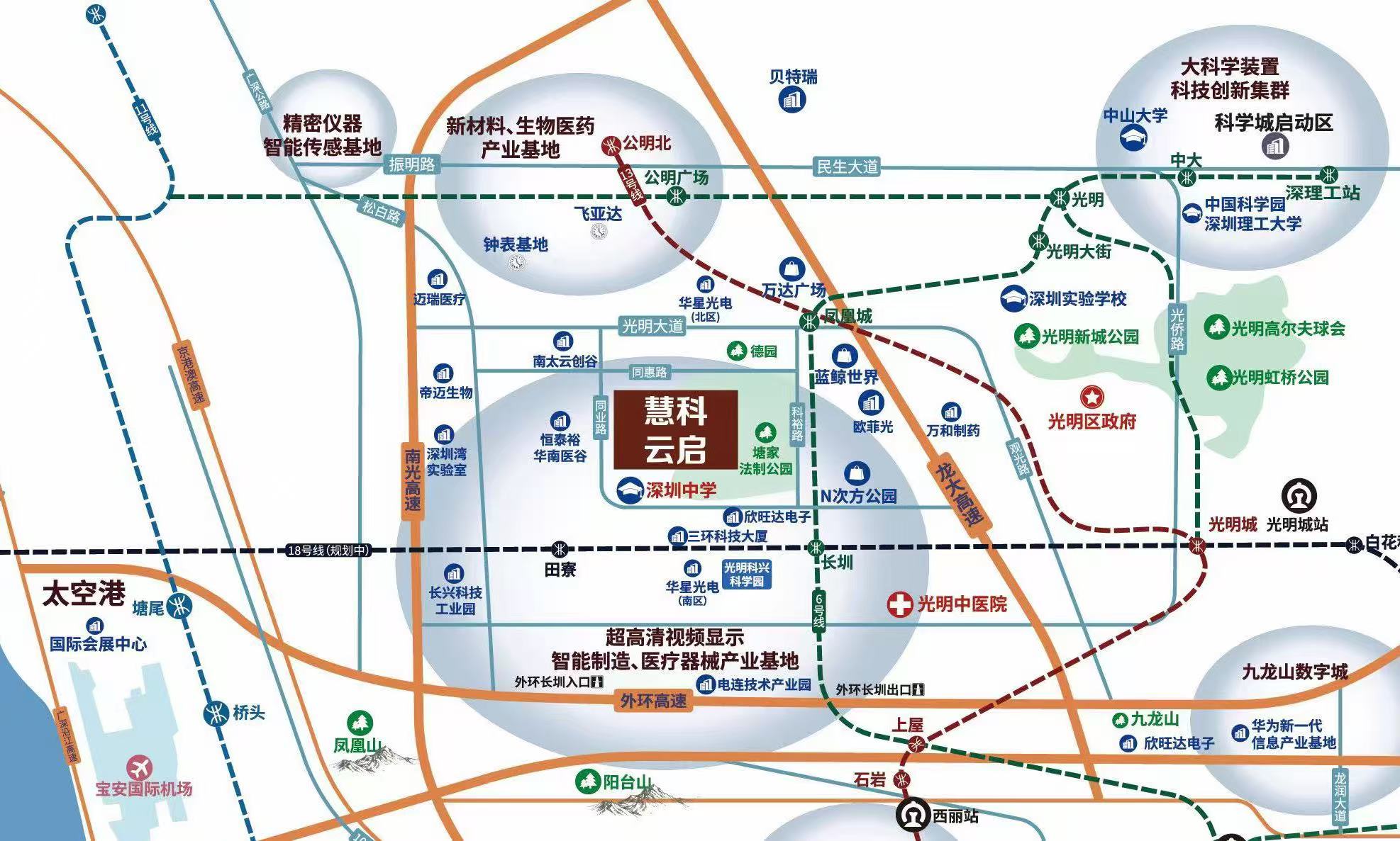 項目區(qū)位優(yōu)勢顯著,坐擁粵港澳大灣區(qū)核心,是廣深港科技走廊的重要節(jié)點,更是光明科學(xué)城——綜合性國家科學(xué)中心核心承載區(qū)的關(guān)鍵產(chǎn)業(yè)載體。交通網(wǎng)絡(luò)四通八達(dá),南光高速、龍大高速、大外環(huán)高速縱橫交錯,光明城高鐵站及地鐵6號線、13號線環(huán)伺周邊。周邊有深圳中學(xué)光明科學(xué)城校區(qū)、有氧公園等配套設(shè)施,聚集華星光電、歐菲光、欣旺達(dá)、邁瑞等龍頭企業(yè),產(chǎn)業(yè)集群效應(yīng)顯著,將與項目形成強大產(chǎn)業(yè)協(xié)同,加速光明區(qū)“基礎(chǔ)研究+技術(shù)攻關(guān)+成果產(chǎn)業(yè)化”創(chuàng)新鏈條閉環(huán),為入駐企業(yè)提供豐富的產(chǎn)業(yè)資源與協(xié)作空間。形成“產(chǎn)城融合、宜居宜業(yè)”的優(yōu)質(zhì)生態(tài)。