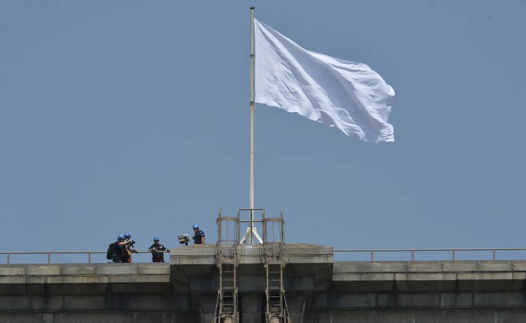 當(dāng)?shù)貢r(shí)間2014年7月22日,美國紐約著名地標(biāo)布魯克林大橋突然掛起了白旗,警方調(diào)查后發(fā)現(xiàn),這是有人惡搞并將美國國旗“漂白”的結(jié)果。圖源:CFP