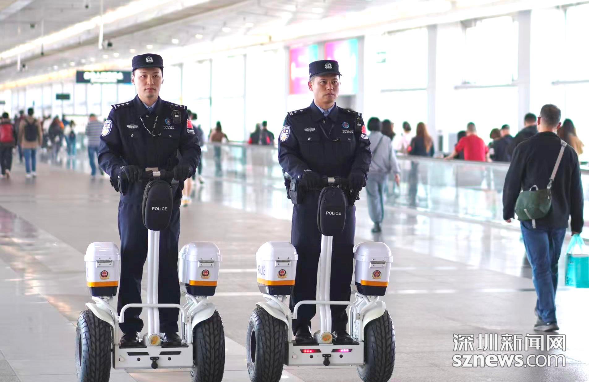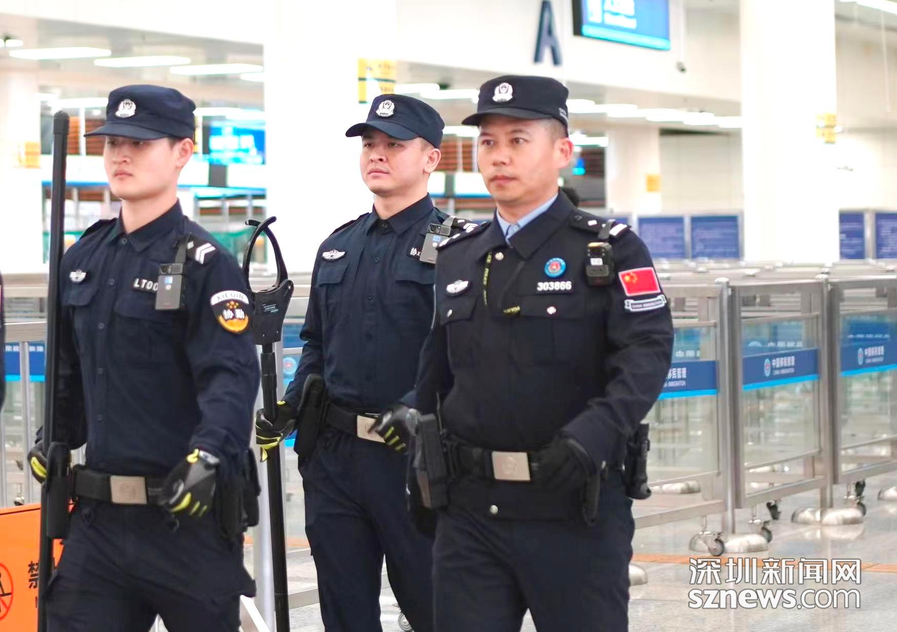 皇崗邊檢站民警余章煥(右一)與戰(zhàn)友在福田口岸出境橋頭巡邏。