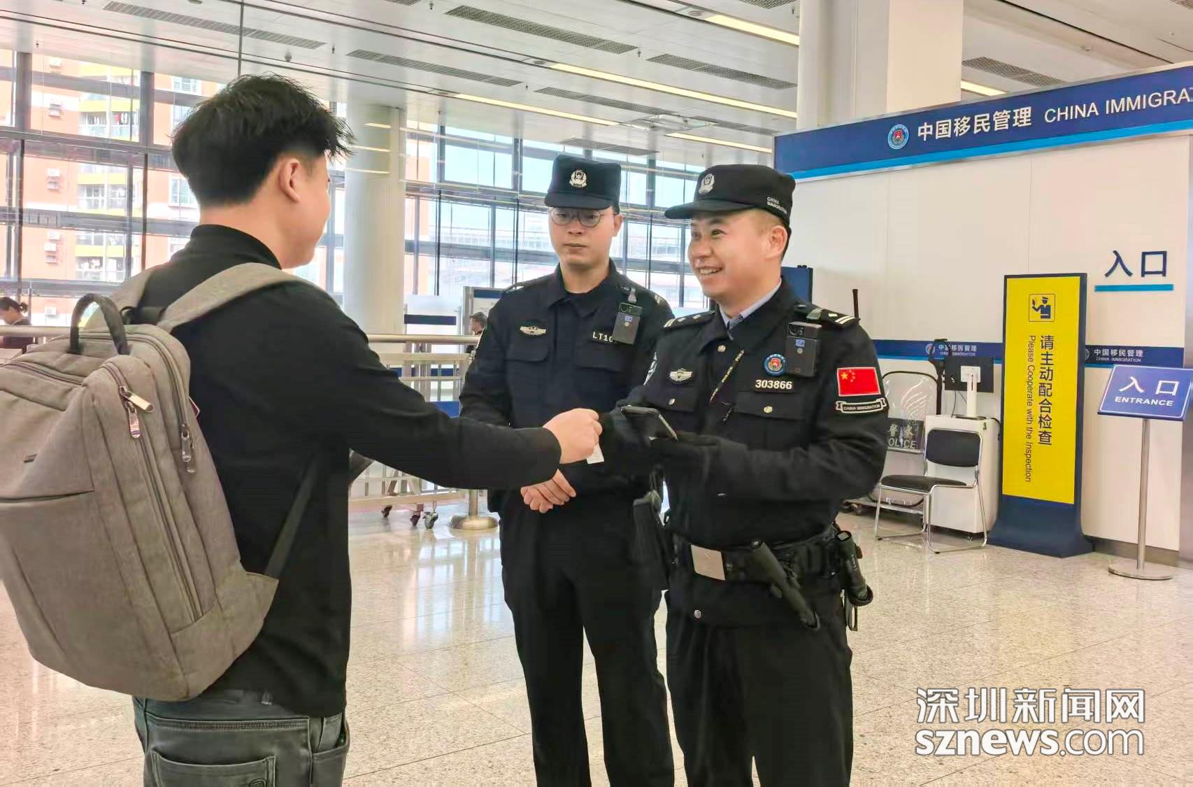 皇崗邊檢站民警余章煥熱情解答出境旅客通關(guān)咨詢(xún)。