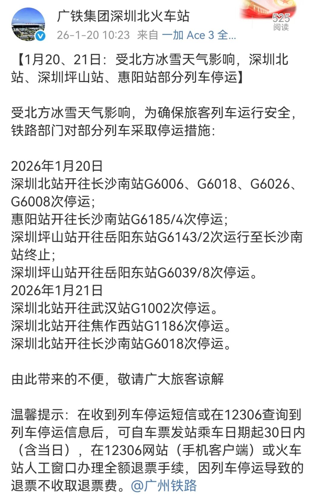 ● 20日,深圳發(fā)布寒冷黃色預(yù)警信號(hào)。受北方冰雪天氣影響,21日,深圳北站、深圳坪山站、惠陽站部分列車停運(yùn)。詳情>>