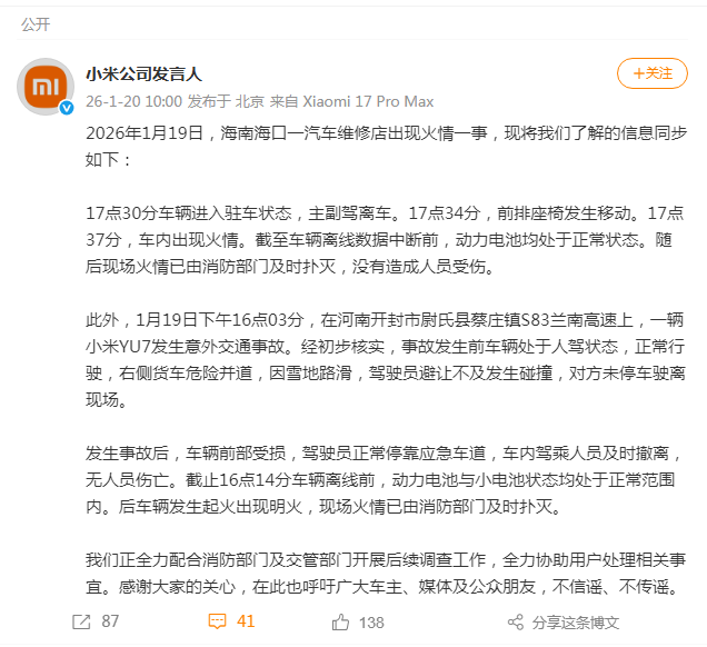 ●小米發(fā)文集中回應(yīng)“海南一汽車維修店出現(xiàn)火情”“蘭南高速YU7交通事故”:動(dòng)力電池均處于正常狀態(tài)。