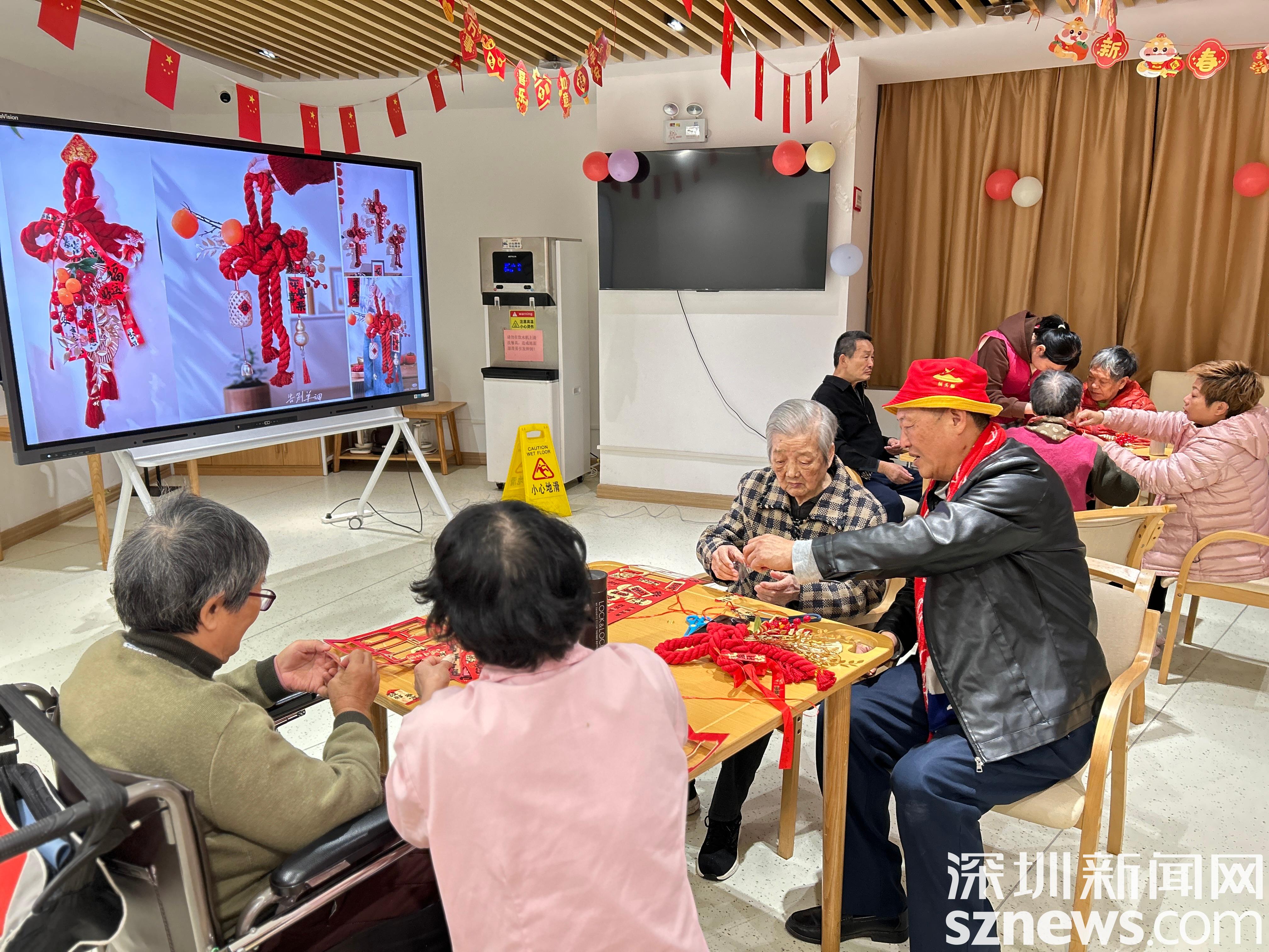 游戲過后,“福韻千千?巧手編結(jié)”手工活動(dòng)暖心登場,為活動(dòng)增添了濃厚的傳統(tǒng)文化氣息。工作人員提前備好色彩艷麗、寓意吉祥的中國結(jié)編織材料,現(xiàn)場逐步驟講解編織技巧,手把手指導(dǎo)老人與家屬動(dòng)手操作。大家圍坐一團(tuán)、分工協(xié)作,耐心打結(jié)、纏繞、修飾,指尖翻飛間,一個(gè)個(gè)承載著平安順?biāo)臁⒓槿缫饷篮闷谠S的中國結(jié)陸續(xù)成型。活動(dòng)尾聲,老人與家屬手持親手制作的中國結(jié)合影留念,用鏡頭定格下這一溫馨難忘的美好瞬間。