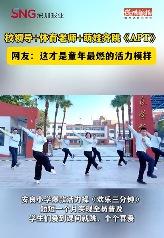● 龍崗:深圳安良小學(xué)校領(lǐng)導(dǎo)帶學(xué)生跳APT沖上熱搜,網(wǎng)友稱“太魔性”。