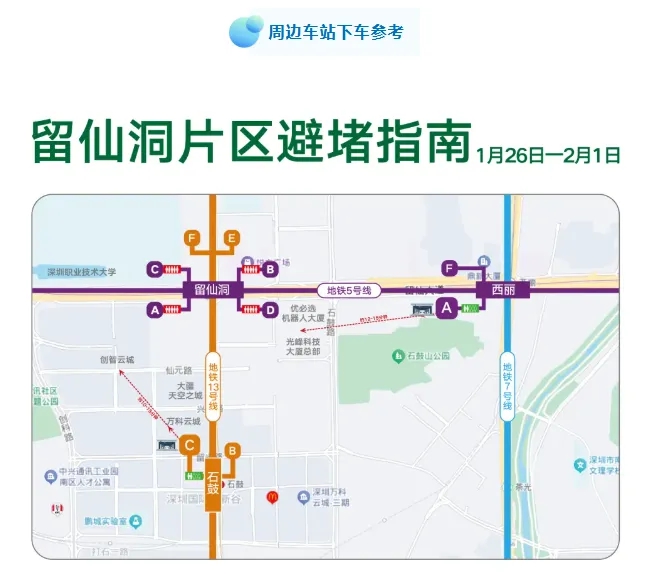 ● 南山:即日起至2月1日深圳地鐵5號(hào)線留仙洞站進(jìn)行提升改造施工,避堵乘車方案公布: