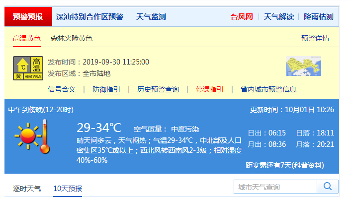 深圳未來一周晴天間多云,陽光充足,天氣干燥,其中29-30日云量增加,濕度略有加大;10月初晴天間多云。