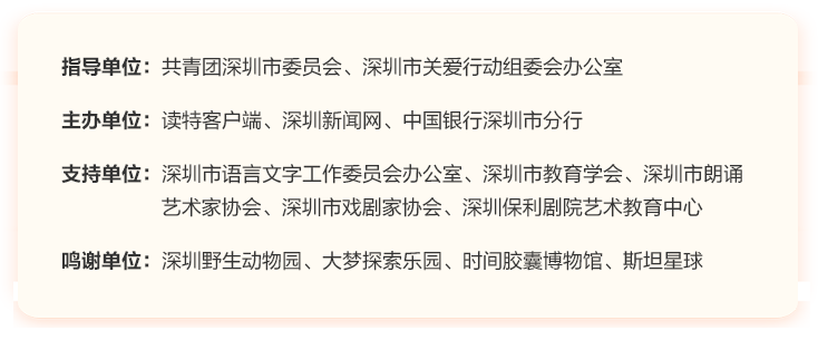 為助力建設(shè)良好的青少年閱讀環(huán)境,激發(fā)學(xué)生閱讀興趣,倡導(dǎo)親子閱讀,共建和諧家庭關(guān)系。2021年,“誰(shuí)是故事大王·第五季”在共青團(tuán)深圳市委員會(huì)、深圳市關(guān)愛行動(dòng)組委會(huì)辦公室的指導(dǎo)下再出發(fā)。更長(zhǎng)的活動(dòng)周期,更豐富的參與形式,更專業(yè)的賽制,等你來(lái)解鎖與挑戰(zhàn)!讓閱讀成為最動(dòng)人的風(fēng)景,讓故事的魅力感動(dòng)深圳。說(shuō)明:所有參賽者報(bào)名成功后,均承認(rèn)并允許主辦方將個(gè)人參加本次活動(dòng)的照片或視頻相關(guān)資料刊發(fā)在各類媒體雜志報(bào)紙上,用于活動(dòng)宣傳。