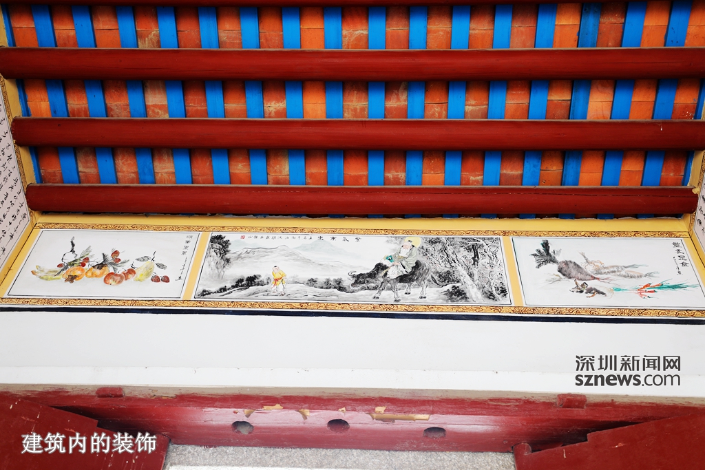 客家圍屋被稱為“東方城堡”,西埔新居的建造者們同樣也嚴(yán)格遵循古法“造城”,近3米高的白褐色外墻將99間房屋圍成一個(gè)方形堡壘,如同一座城堡。圍屋核心的李氏宗祠歷經(jīng)歲月洗禮,屋頂飛檐飾以仙鶴、麒麟、鹿等吉祥物,外壁上繪著山水畫,宗祠內(nèi)雕梁畫棟。以李氏祠堂為中軸線,左右對(duì)稱的99間居民房屋成行成列。圍屋內(nèi)巷道縱橫交錯(cuò),居民家內(nèi)收拾得干干凈凈,很是整潔,門口還種有花草,生活的樂趣撲面而來。