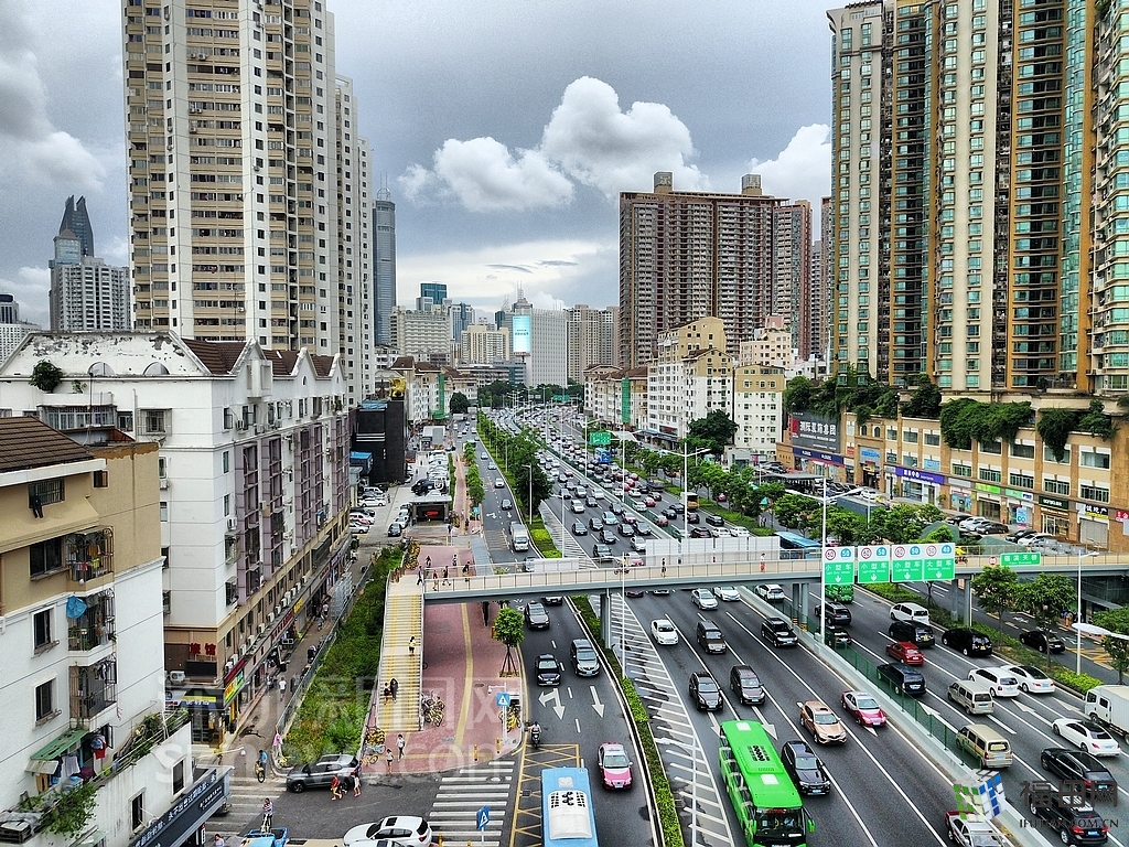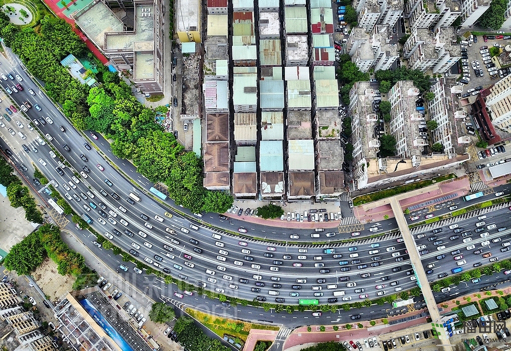 緊鄰福田村的濱河大道車水馬龍。
