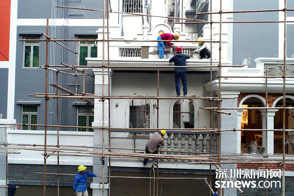 12月14日下午,建筑工人對水圍村民房進行外立面改造