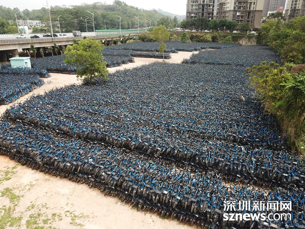 大量的小藍單車堆放在龍崗區(qū)水官高速旁的空地