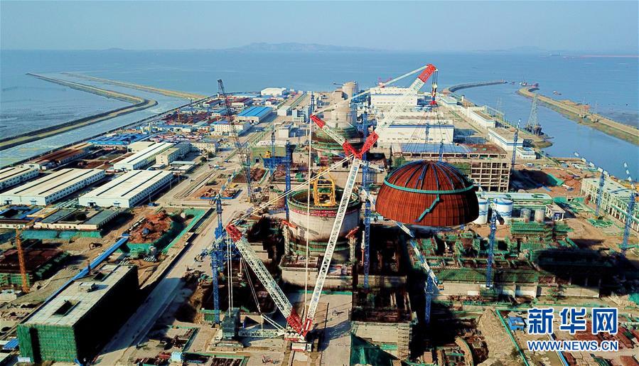 3月21日拍攝的中核集團(tuán)福清核電6號機(jī)組反應(yīng)堆穹頂?shù)跹b現(xiàn)場(無人機(jī)拍攝)。