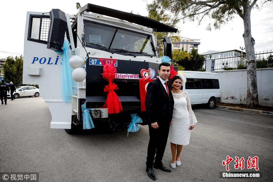 當(dāng)?shù)貢r(shí)間2018年3月21日,土耳其安塔利亞,警官Ceren Ekici和Taha YasinGul舉行婚禮。在10個(gè)月前的一次行動(dòng)中,Taha YasinGul不慎開槍擊中Ceren Ekici的頭部,所幸沒有造成生命危險(xiǎn)。他們的婚禮由警局同事操辦,同事們舉著防彈盾牌,護(hù)送這對(duì)新人走向禮臺(tái)。圖片來源:視覺中國