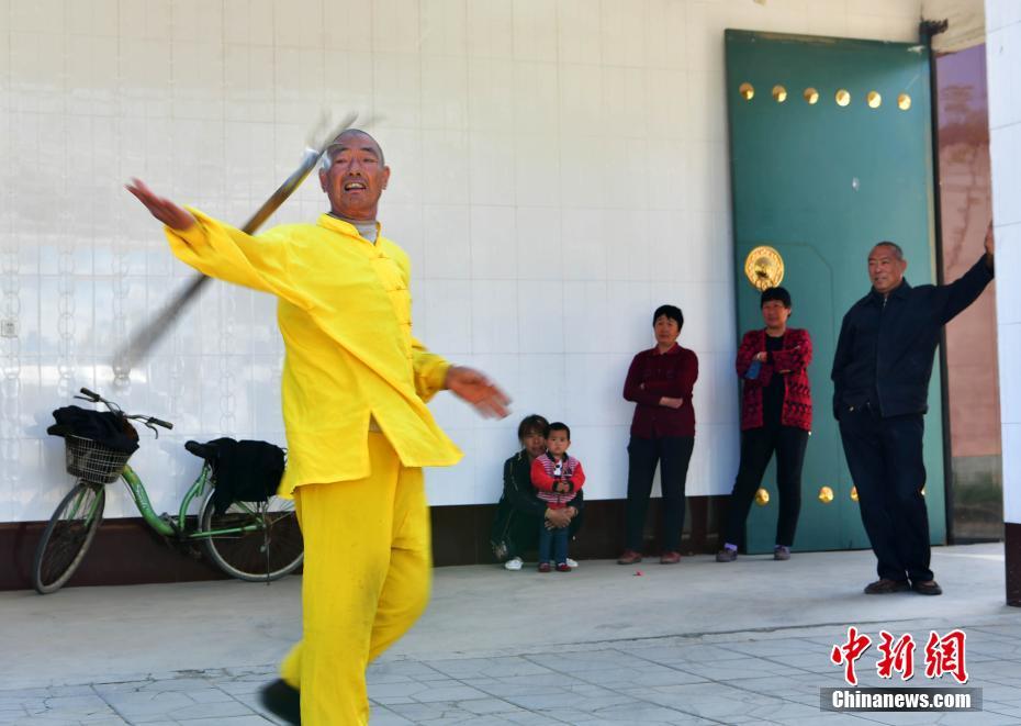 4月11日,在河北趙縣何莊,農(nóng)民蘇煥未(左一)的“滾鋼叉”技藝表演吸引了圍觀者的眼球。67歲的蘇煥未出身武術(shù)世家,自幼練就一手出神入化的滾鋼叉絕技。滾鋼叉又叫鋼叉舞、耍鋼叉,以表演驚險著稱。老人的表演出神入化,鋼叉能耍出空中飛叉、滾蹚紅、金鉤釣魚、穿脖穿腰等十幾種花樣。蘇煥未表示,滾鋼叉因為練習非常辛苦,很少有年輕人愿意學(xué),他希望該民間技藝得到相關(guān)部門保護。中新社記者翟羽佳 攝