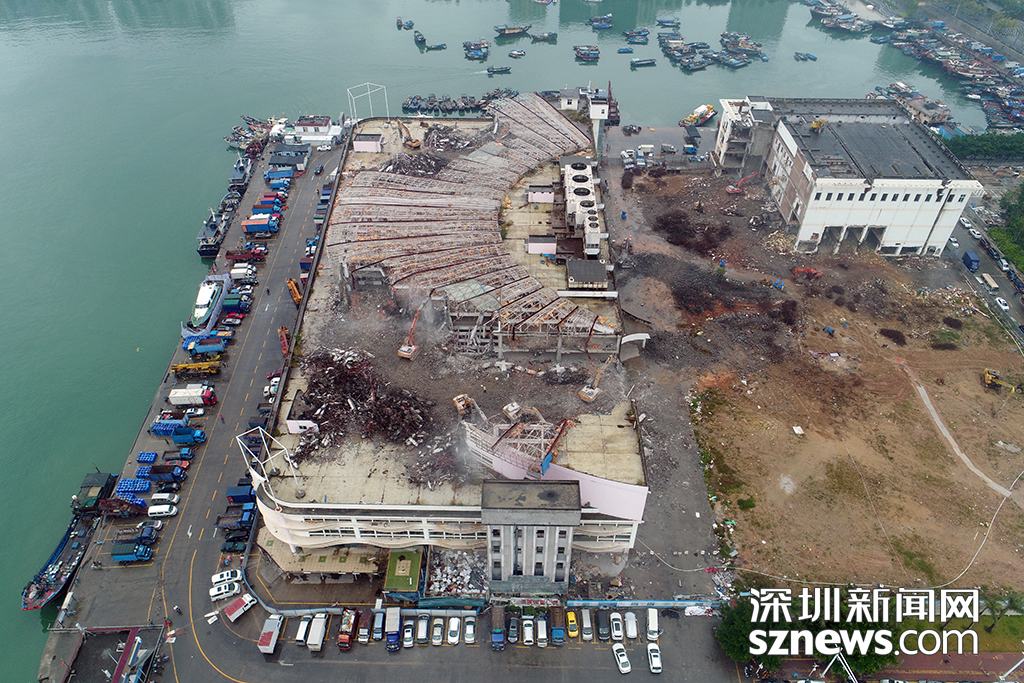 漁人碼頭拆除現(xiàn)場,原漁人碼頭水產交易市場的頂層已快拆除過半