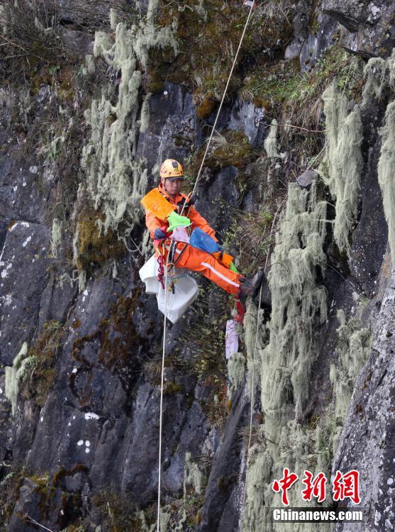 5月1日,四川峨眉山,樂(lè)山山地救援隊(duì)隊(duì)長(zhǎng)王麒正在清理峨眉山金頂崖壁上的垃圾。中新社記者 劉忠俊 攝