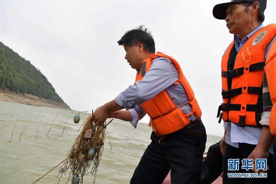 在鄱陽(yáng)湖湖口段,江豚協(xié)助巡護(hù)隊(duì)隊(duì)員在湖面上清繳排鉤等違規(guī)作業(yè)工具(5月5日攝)。新華社記者 彭昭之 攝