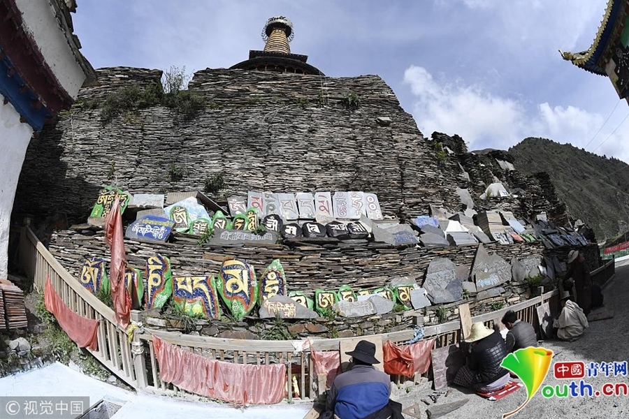 在四川阿壩州壤塘縣棒托寺內(nèi)珍藏約50萬片明清時期鐫刻的大藏經(jīng)《甘珠爾》和《丹珠爾》,大藏經(jīng)左高9.7米,右高9.2米,長46米、左寬160米,右寬13米,占地598平方米,是目前全世界保存最完整、規(guī)模最宏大、內(nèi)容最豐富的石刻大藏經(jīng)孤品。據(jù)史料記載,由明末清初60余名石匠辛勤鐫刻9年而成。石刻藏文經(jīng)書圖文并茂,筆法流暢,疏密有致,陰陽相背,滿版生輝。具有極高的文物和藝術(shù)研究價值。圖為堆積的石刻大藏經(jīng)孤品。