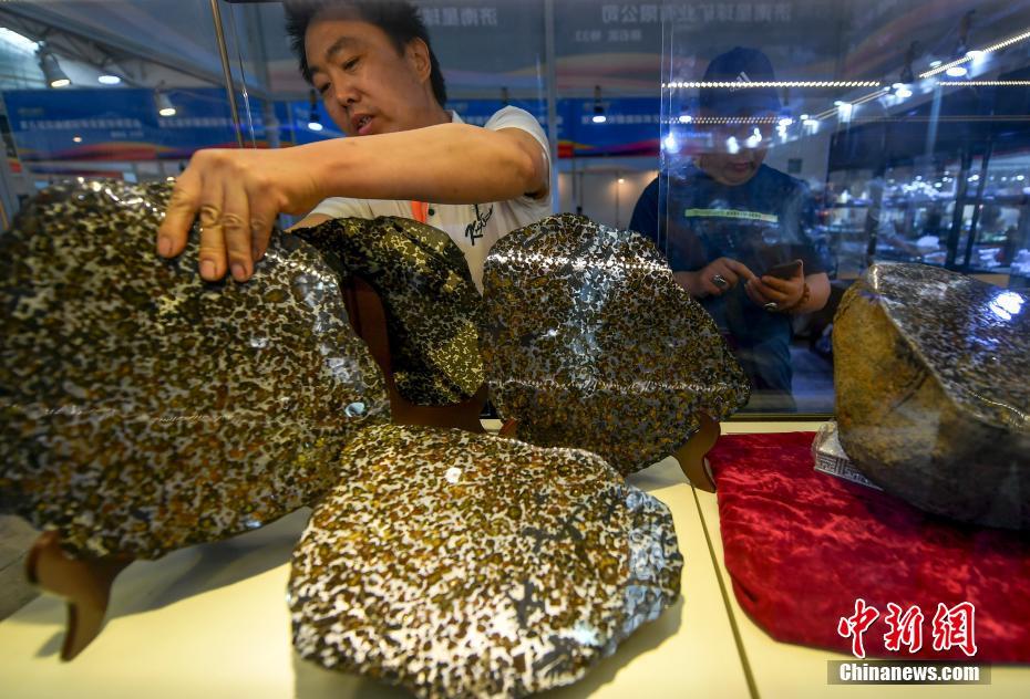 6月15日,第十一屆新疆觀賞石、和田玉精品博覽會在位于新疆烏魯木齊市紅光山的新疆國際會展中心開幕,本次博覽會參展種類涵蓋珠寶、玉石、礦石、隕石、觀賞石等,吸引眾多奇石玩家到場“以石會友”,打造獨具特色的“品石”盛宴。圖為一展位前的橄欖隕石切片吸引隕石收藏者。中新社記者劉新 攝
