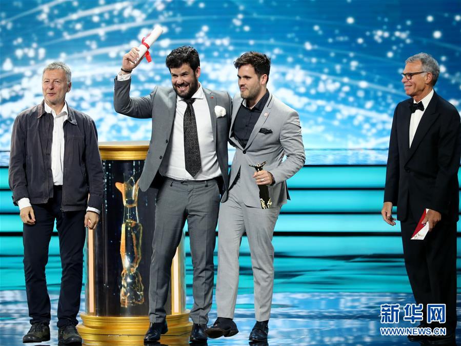 6月24日,加拿大導演兄弟塞巴斯蒂安·巴魯索(右三)與羅德里戈·巴魯索(右二)憑借電影《翻譯家》獲“最佳導演獎”。當日,第21屆上海國際電影節(jié)金爵獎頒獎典禮在上海大劇院舉行。新華社記者 劉穎 攝