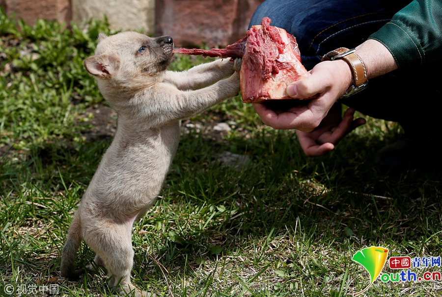 當(dāng)?shù)貢r(shí)間2018年5月11日,俄羅斯克拉斯諾雅茨克,當(dāng)?shù)貏游飯@飼養(yǎng)員給一只1月大的印度野狗Gelya喂食。