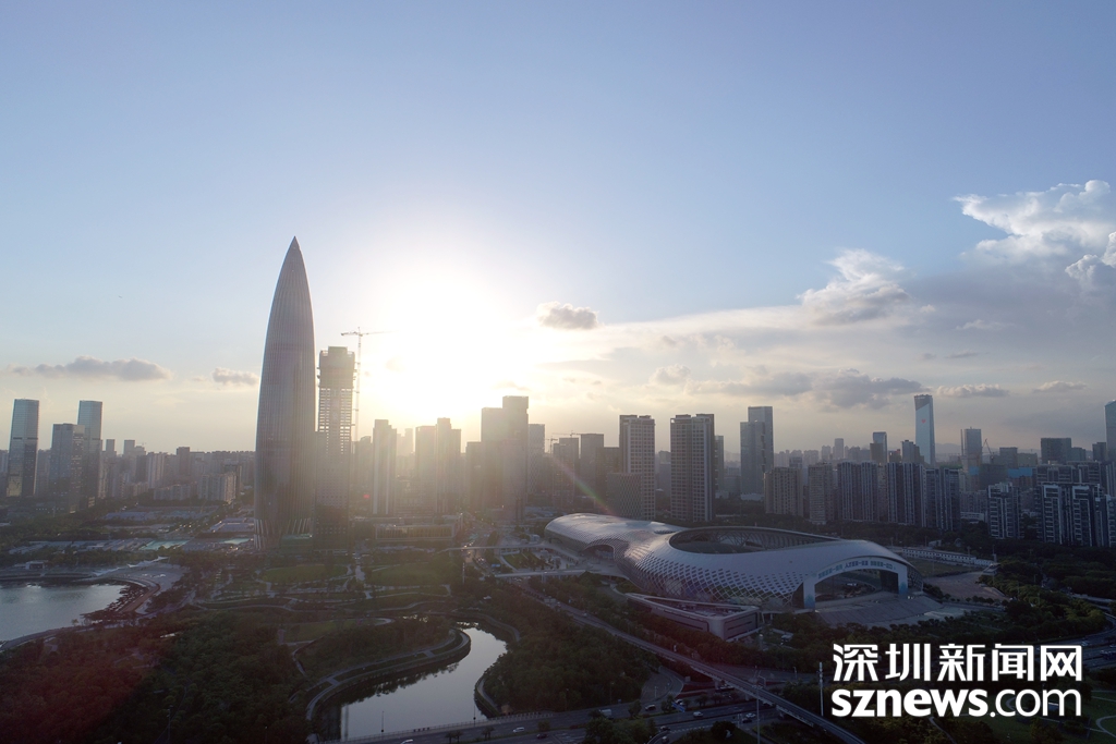 夕陽為深圳灣體育館和華潤大廈打上柔美的輪廓光