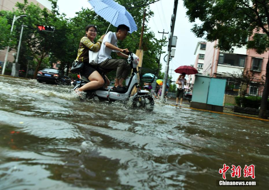 7月16日下午,河北石家莊一條馬路積水嚴(yán)重,民眾涉水騎行。當(dāng)日,該省氣象臺(tái)發(fā)布暴雨藍(lán)色預(yù)警,承德、雄安新區(qū)、廊坊北部、石家莊中西部、邢臺(tái)西部等多地遭受暴雨襲擊。中新社記者翟羽佳 攝