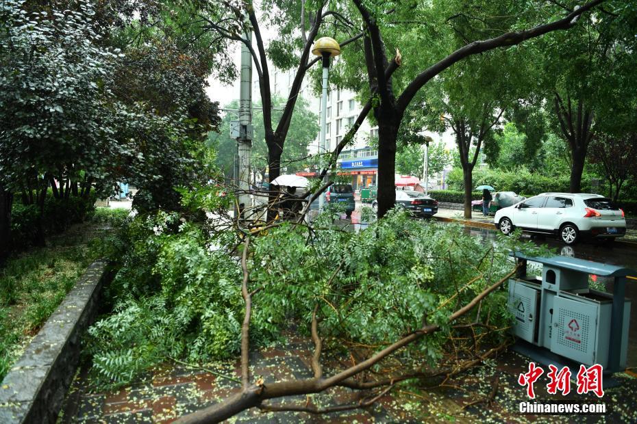 7月16日下午,河北石家莊街頭,樹枝被暴風(fēng)雨折斷。當(dāng)日,該省氣象臺發(fā)布暴雨藍(lán)色預(yù)警,承德、雄安新區(qū)、廊坊北部、石家莊中西部、邢臺西部等多地遭受暴雨襲擊。中新社記者翟羽佳 攝