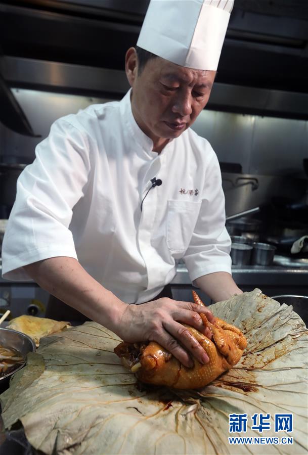 杭州酒家老板吳瑞康現(xiàn)場制作本店招牌菜“叫化雞”(6月16日攝)。 金庸在武俠小說《神雕俠侶》中借郭靖之口說過: “為國為民,俠之大者。”武俠精神在香港備受推崇,有其心向中華文化的情感基礎(chǔ)。在這個(gè)國際美食之都,品味舌尖上的武俠味,內(nèi)中的感覺別有深意。新華社記者 李鵬 攝