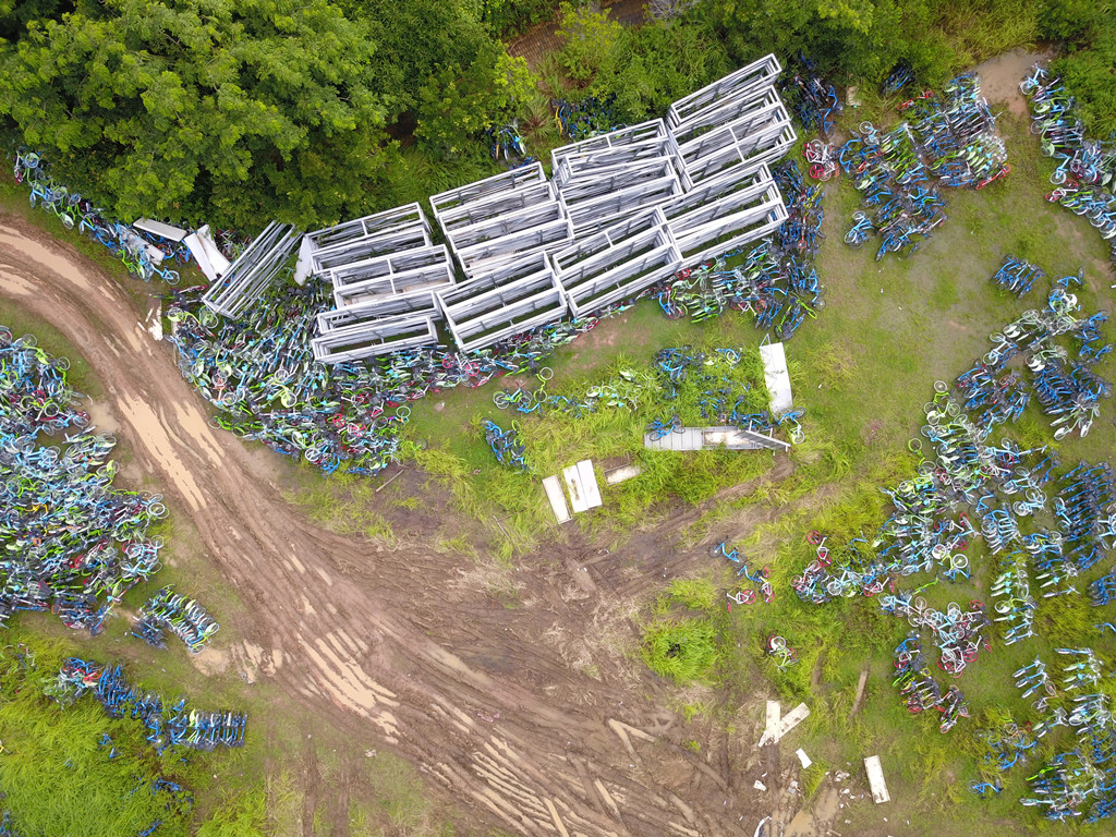從高空中能夠看到,堆放的單車大多為目前無法正常運營的酷騎、小藍(lán)單車
