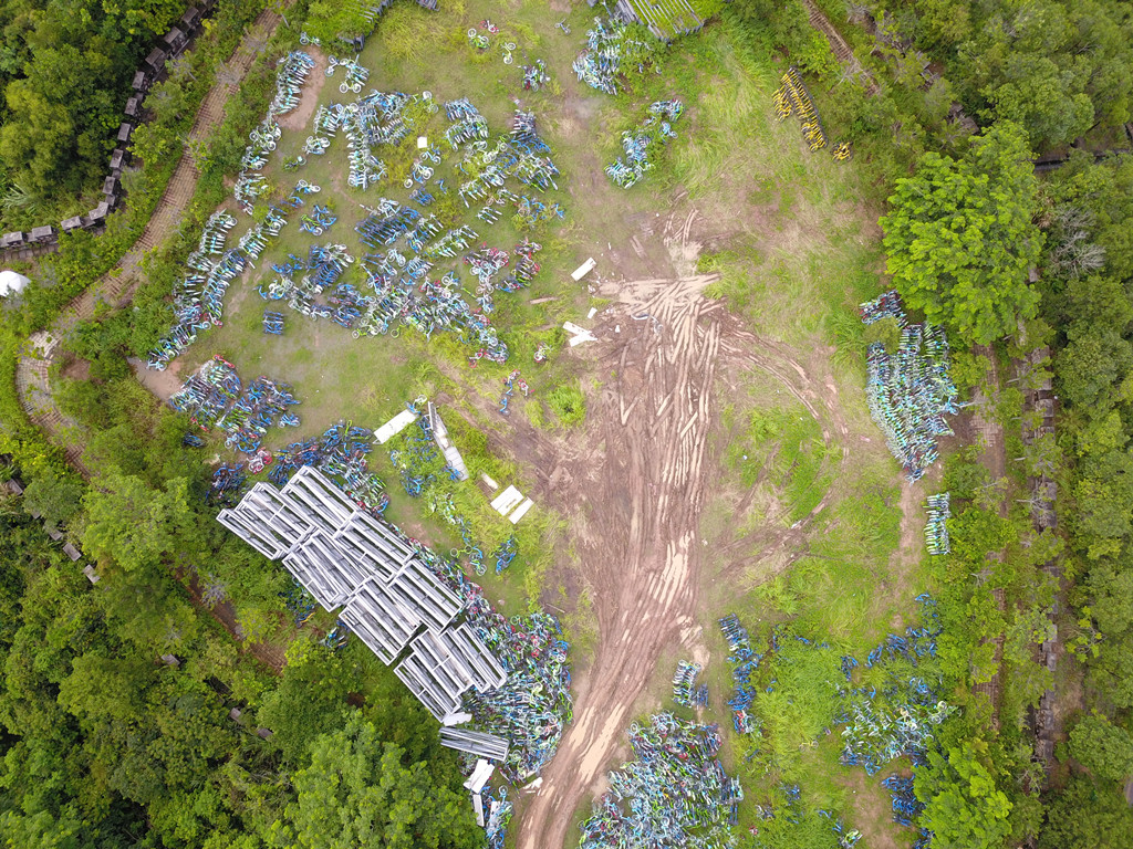 從無人機鏡頭里可以看到,大量共享單車被堆積在安托山山頂空地上,非常隱蔽,一般人很難發(fā)現(xiàn)