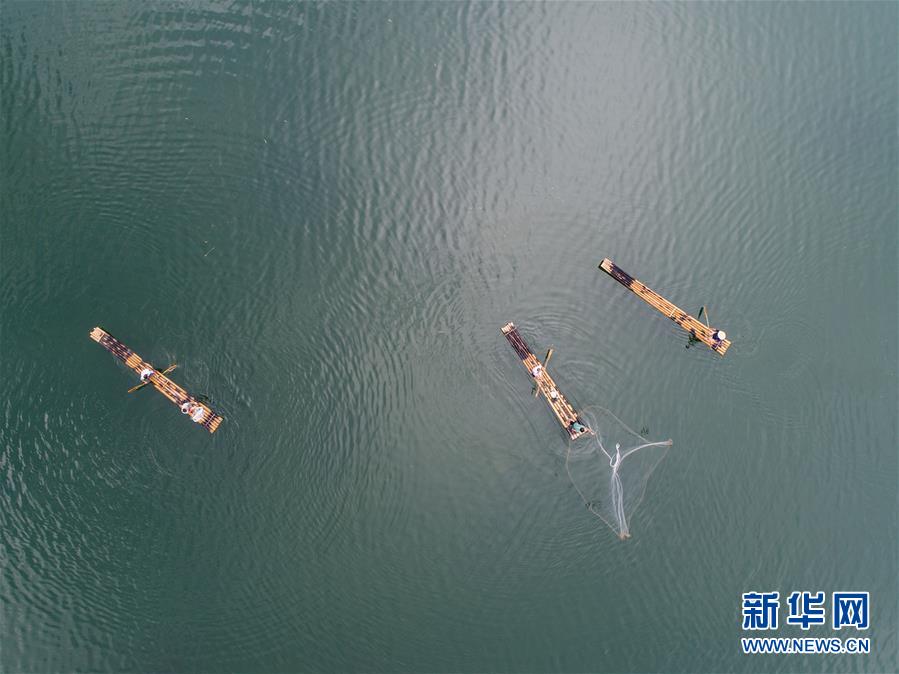 8月1日,淳安縣汾口鎮(zhèn)紅星村的漁民乘著竹排,在千島湖的支流武強(qiáng)溪上進(jìn)行撒網(wǎng)捕撈作業(yè)(無人機(jī)拍攝)。新華社記者 徐昱攝