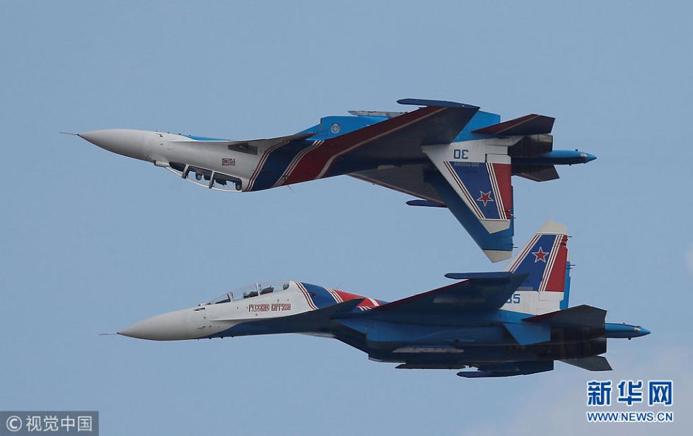 當(dāng)?shù)貢r(shí)間2018年8月4日,俄羅斯梁贊,2018“航空飛鏢”國(guó)際軍事比賽即將開幕,特技飛行隊(duì)在彩排。(圖片來源:視覺中國(guó))