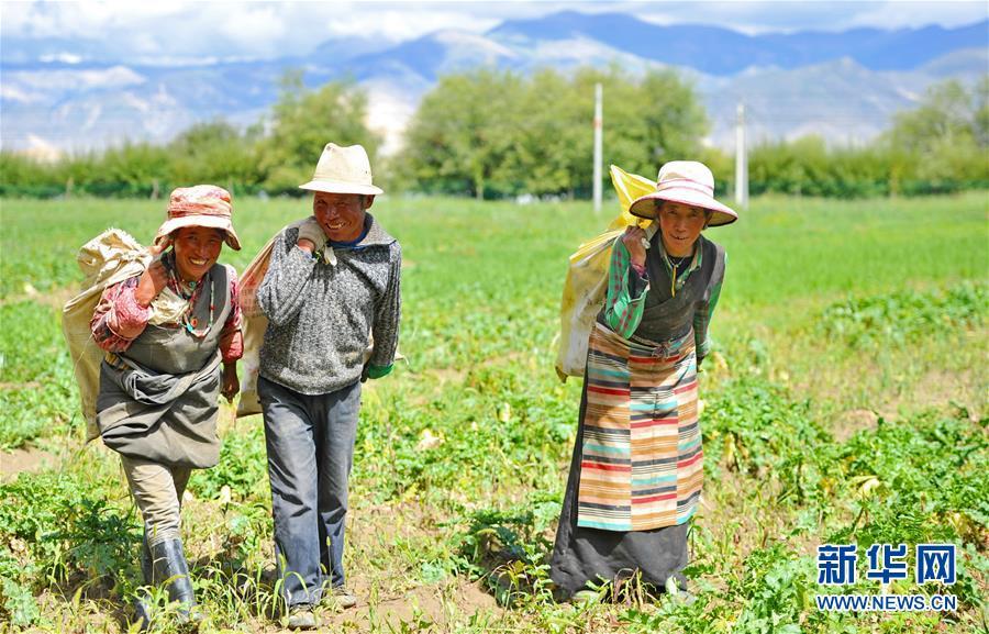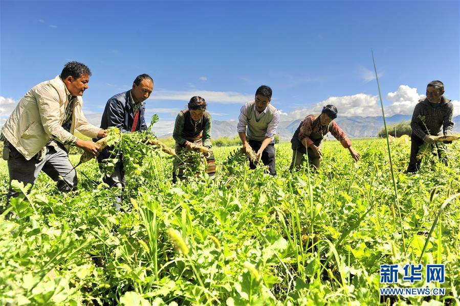 8月8日,在邊雄鄉(xiāng)普夏村蘿卜種植基地,白瑪梅朵合作社工作人員和當(dāng)?shù)厝罕娨黄鹗斋@蘿卜。 新華社記者 張汝鋒 攝