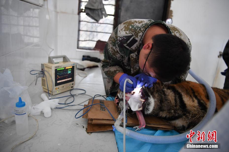 8月9日,獸醫(yī)使用洗牙機(jī)為老虎洗牙。當(dāng)日,位于昆明的云南野生動(dòng)物園獸醫(yī)通過呼吸麻醉的方式,為園中一只一歲的老虎清潔牙。中新社記者 劉冉陽 攝