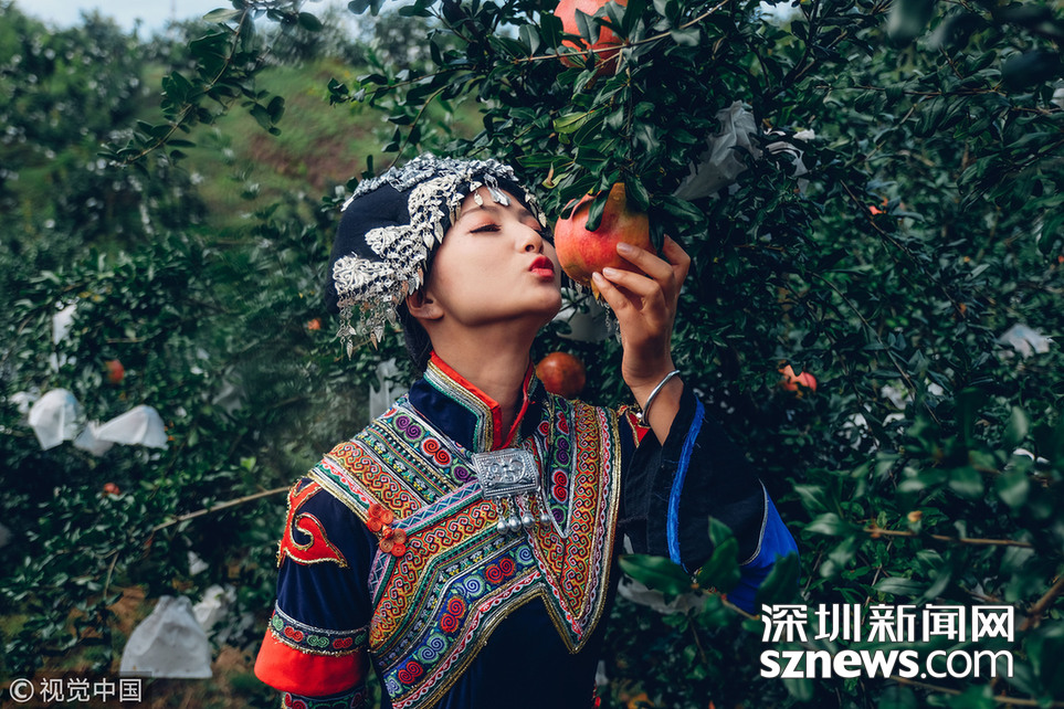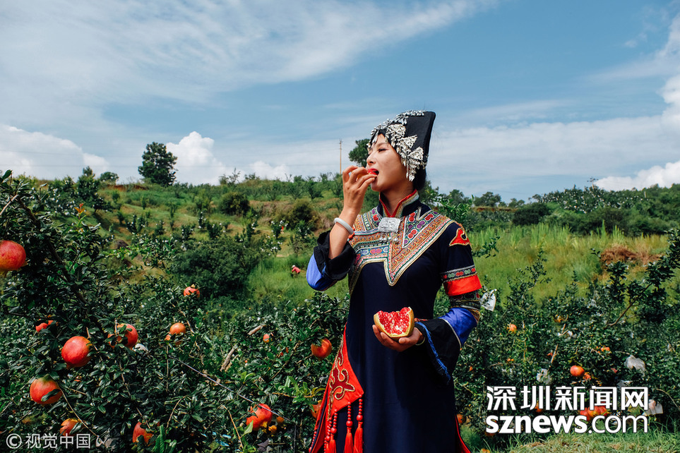 會理如今大面積種植來自北非突尼斯的軟籽石榴,籽粒柔軟,可以直接食用無需吐籽,果味兒濃甜似蜂蜜,可食部位達(dá)55.7%,自然儲藏可達(dá)3個月,冷庫儲藏可達(dá)5個月,是目前世界上籽粒最軟的石榴品種,也是中國石榴最優(yōu)秀的品種。拍攝當(dāng)天氣溫有些高,鄧通敏穿著比較厚的彝族服裝。完成拍攝后,她迫不及待想嘗嘗這剛從樹上摘下來的果子?!疤瓦m了!”鄧通敏說。