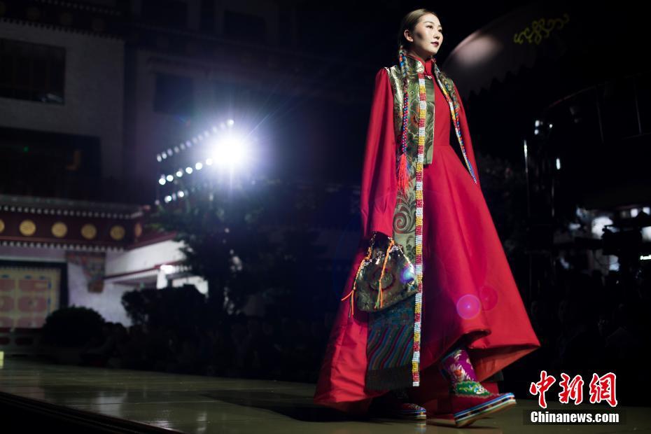 8月12日晚,由西藏職業(yè)技術(shù)學院與北京服裝學院共同打造的“凈美雪頓·美好生活”西藏民族服裝與服飾展演活動在拉薩舉行?,F(xiàn)場通過傳統(tǒng)篇、現(xiàn)代篇與未來篇三個篇章,展演了藏族傳統(tǒng)服裝26套,設(shè)計創(chuàng)新服裝58套,共計84套服裝。圖為模特展示現(xiàn)代設(shè)計的創(chuàng)新藏族服飾。中新社記者何蓬磊 攝